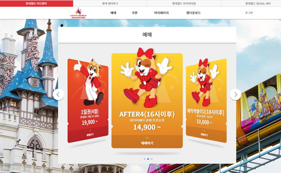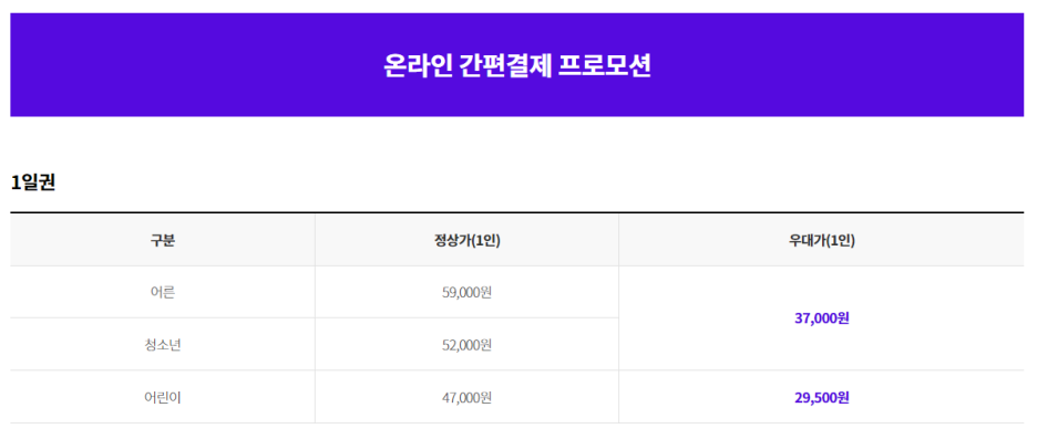 할인되는 예매는 1일권-19,900원, AFTER4(16시 이후)14,900원, 매직싹쓸이2(18시 이후)10,000원
