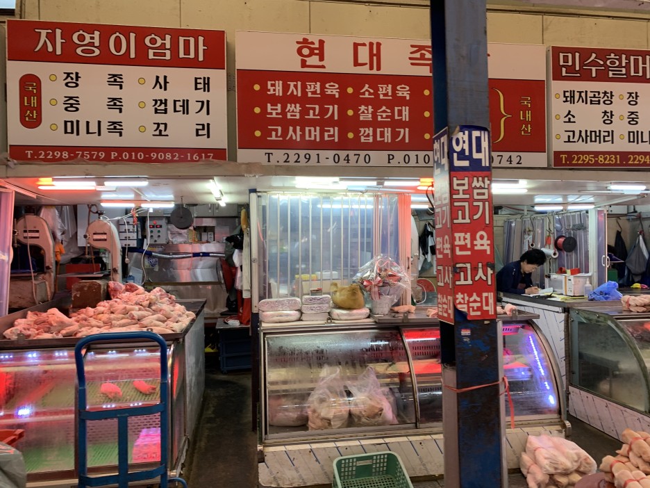 저희는 서문으로 들어가기 시작했던 것 같아요. 이렇게 쭈우욱~ 들어가자마자부터 소고기, 부속품등 축산시장이 펼쳐집니다. 와 신세계였어요.