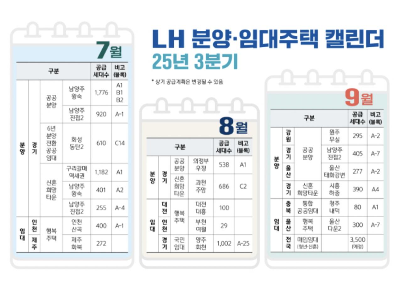 2025년 LH 분양 및 임대주택 캘린더 (25년 3분기)를 안내합니다.